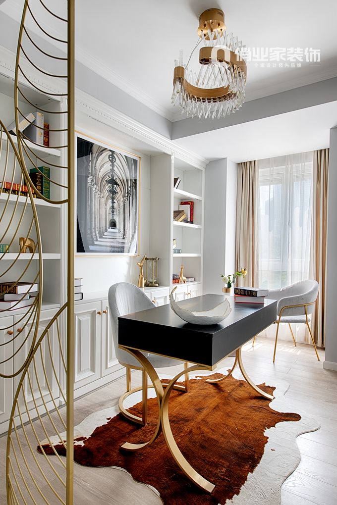 剛踏上二樓,就可見這個(gè)開放式的書房,不大卻十分精致。設(shè)計(jì)師吳萱原創(chuàng)設(shè)計(jì)的隔斷樣式,古銅色的金屬線條裝飾成嶄新的隔斷,獨(dú)一無二。開放的空間,精致的家具,時(shí)尚的獨(dú)椅。。。拿本書就可以從辦公狀態(tài)切換到閱讀時(shí)間,享受生活。