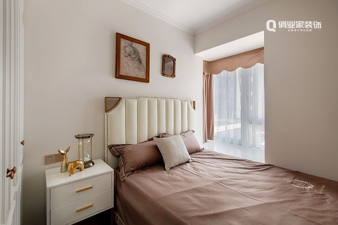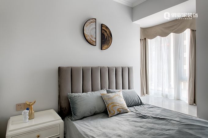 主臥延續(xù)了客廳的色系,造型上做了邊吊和線條,增添了幾分精致感。軟裝搭配上也更是延續(xù)了整體一致的格調(diào),空間的切換顯得流暢自然。