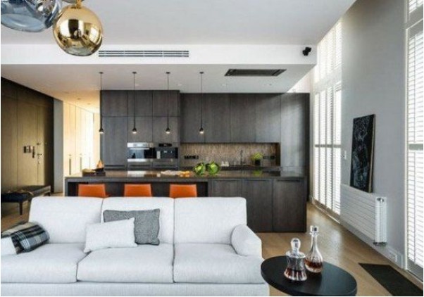 客廳和餐廳、廚房同處一個(gè)空間中個(gè),可是兩者之間還是對(duì)比簡(jiǎn)單就區(qū)別出來的。餐廳的櫥柜徹底采用黑灰色,橙色的椅子裝點(diǎn)其間,點(diǎn)亮了整個(gè)空間的生機(jī)??窟呴L(zhǎng)長(zhǎng)的走廊止境是一扇大窗,光線從后面照進(jìn)房中。