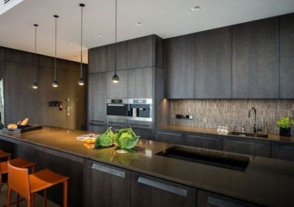 一字型的櫥柜時(shí)最不占地方一起又對(duì)比有用的櫥柜類型。將墻面空間徹底占有之后還能留下滿足回身的空間以及一個(gè)長(zhǎng)條形的用餐區(qū)和操作臺(tái)的結(jié)合部,一箭雙雕的規(guī)劃。黑色的木質(zhì)紋理外表也是讓整個(gè)廚房讓人愛不釋手的緣由地點(diǎn)。