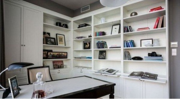 小巧的書房空間,滿墻的柜子都是極好的收納空間,一層一層的擱架能極好的將書本之類的東西進(jìn)行分類。白色的柜子和灰色的墻面搭配在一起取得了很不錯(cuò)的作用。